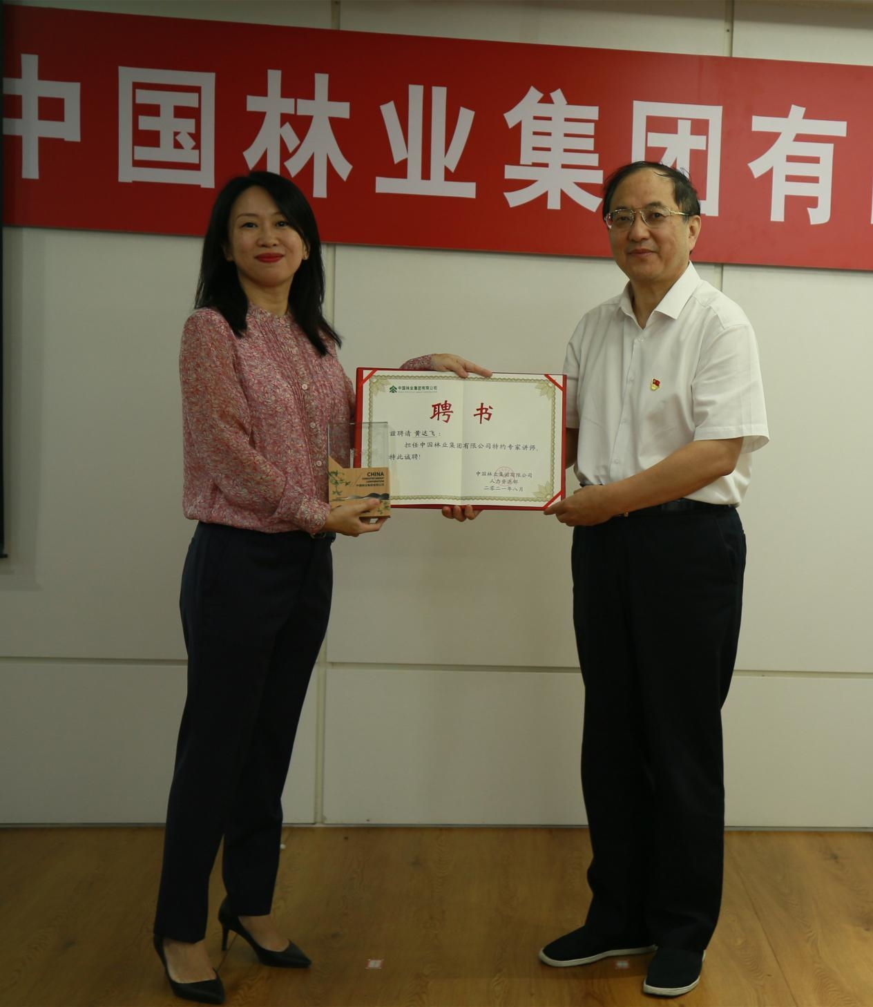 通过授课,集团公司广大职工对“碳达峰、碳中和”相关背景、政策有了进一步了解,同时也为集团公司下一步推进林业碳汇相关工作提供了指导和借鉴。集团公司董事、党委副书记刘连军为黄达飞颁发了“中林集团专家讲师”奖杯和聘书。