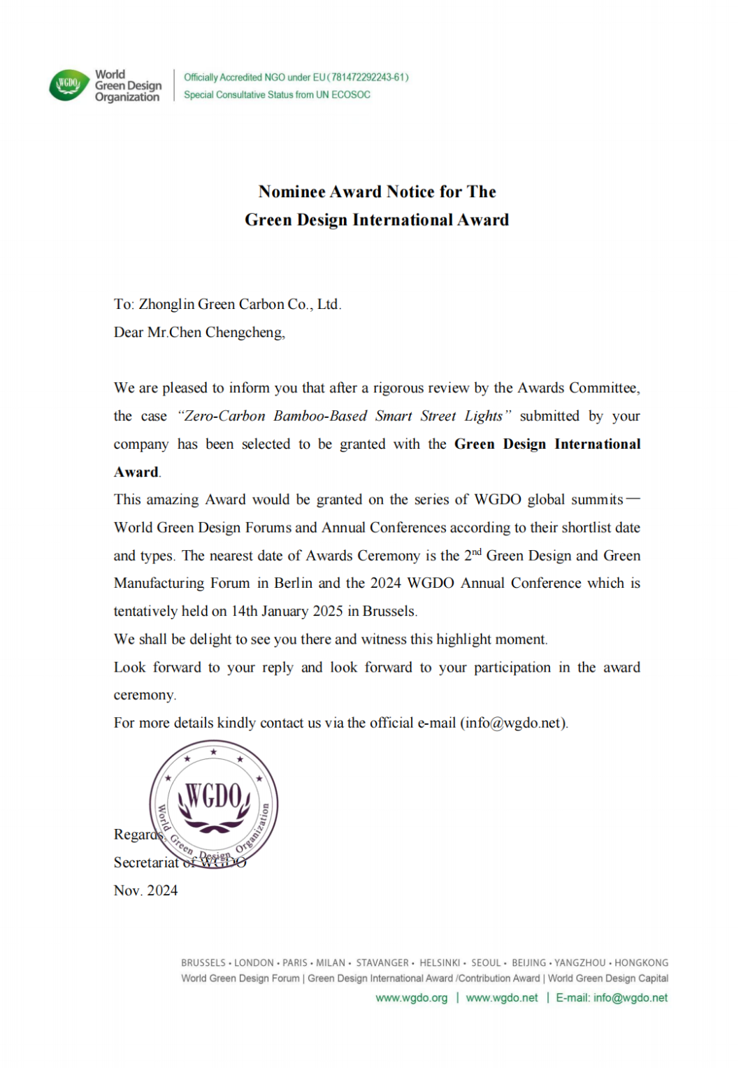 近日,世界绿色设计组织(World Green Design Organization,简称 WGDO)在全球范围内征集绿色设计案例,中林绿碳竹基智慧灯杆项目经过评奖委员会的严格审查,已被授予绿色设计国际大奖 (Green Design International Award) ,将于WGDO全球峰会系列活动世界绿色设计论坛上正式颁发。