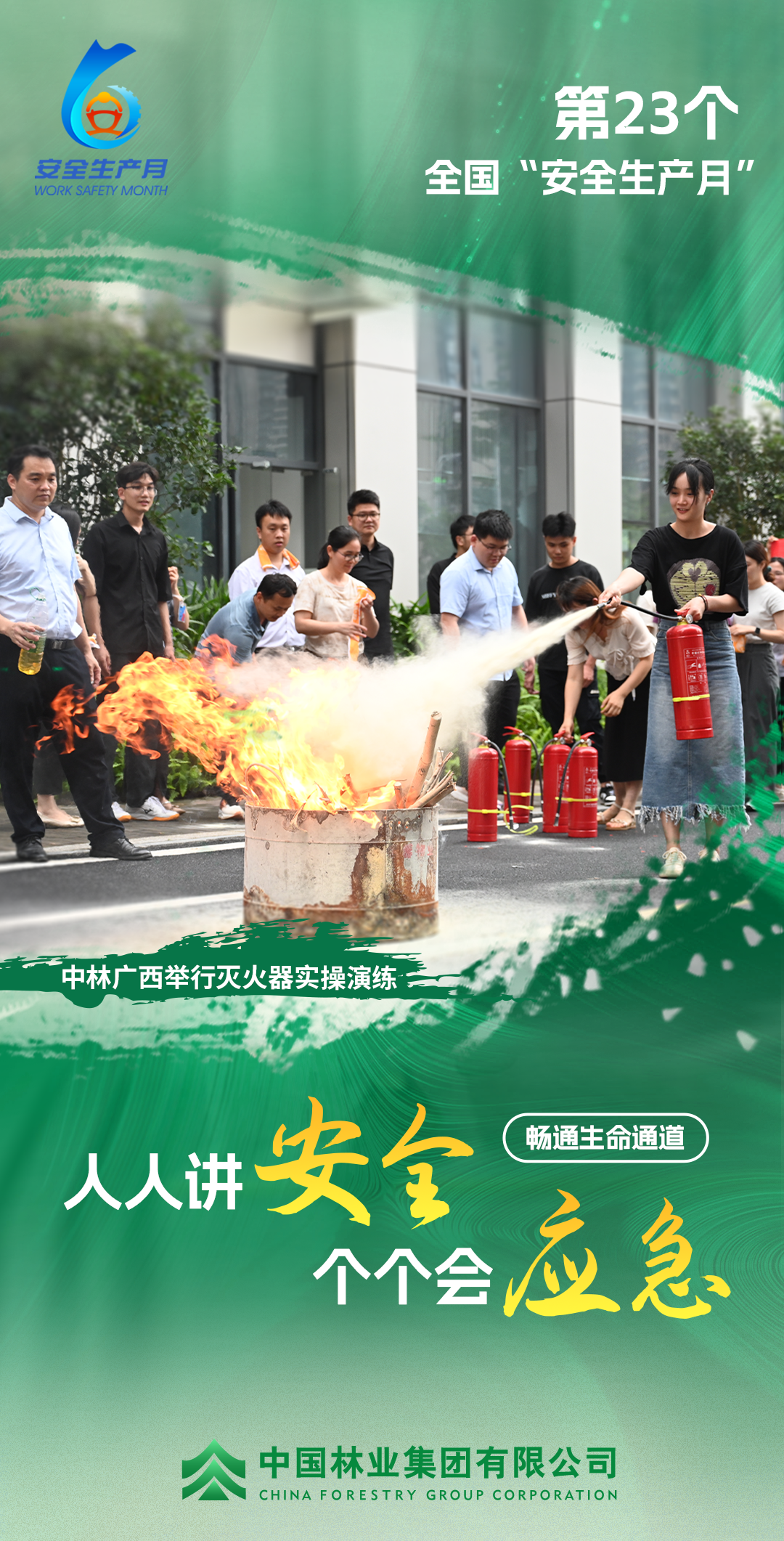 中林广西深入贯彻习近平总书记关于安全生产重要论述和重要指示批示精神,认真落实国务院国资委和集团公司对“安全生产月”活动的工作部署,扎实推进“安全生产月”系列活动,按照相关要求,召开动员部署大会,安排部署“安全生产月”活动各项工作;在总部开展消防应急演练,活动模拟办公场所突发火情,干部职工在工作人员的组织下,俯身、弯腰有序撤离至空旷地带,撤离过程高效、安全,未出现安全事件,随后大家在专业人员的带领下,分批次实操使用干粉式灭火器进行火源扑杀。演练整体流程顺畅、各环节衔接紧密,有力夯实了职工的安全意识和企业的应急处置能力。