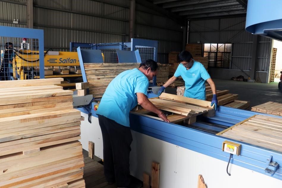 国庆假期,中林雷林工业有限公司工人坚守岗位,开展木材去皮切片工作。