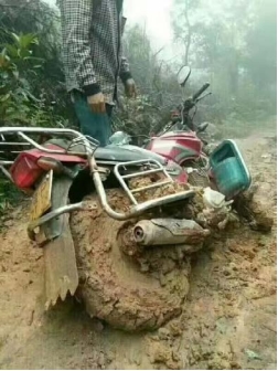 莫锦权的摩托车轮裹满了黄泥