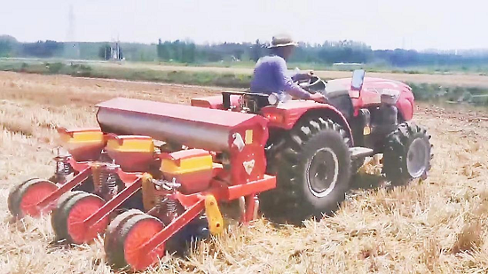 “春争日,夏争时。”小麦收获后,农田失墒严重,山东中林东平湖发展有限公司“四位一体”生态循环农业基地科学应对不利因素,趁墒抢播夏玉米,力争在6月底前完成1000亩地播种。烈日当空,播种机开足马力穿梭于